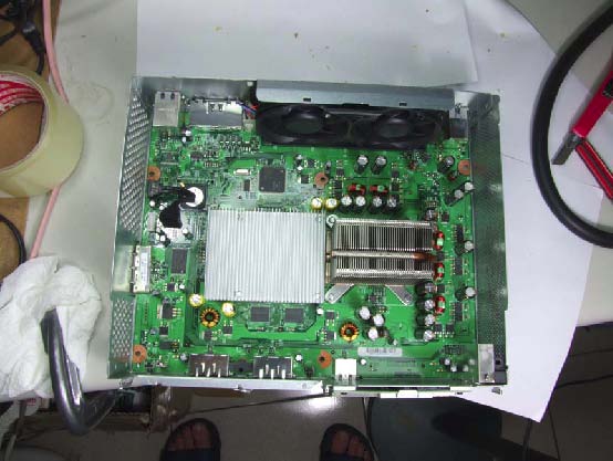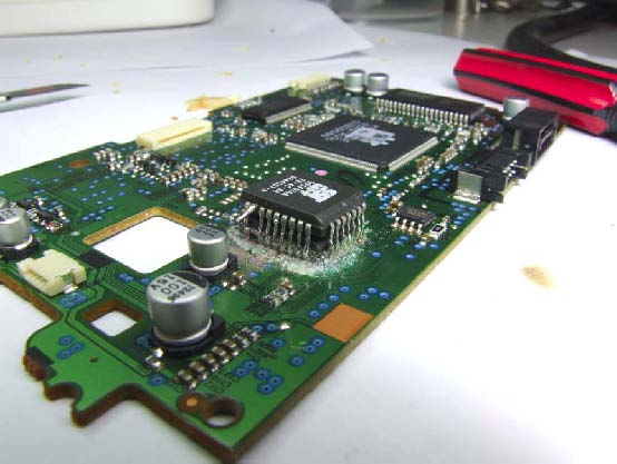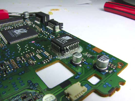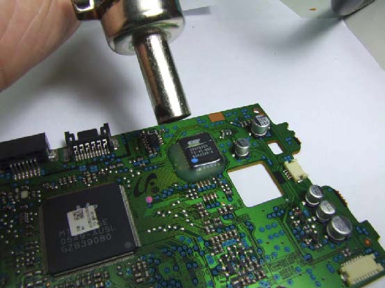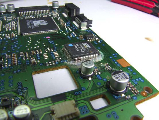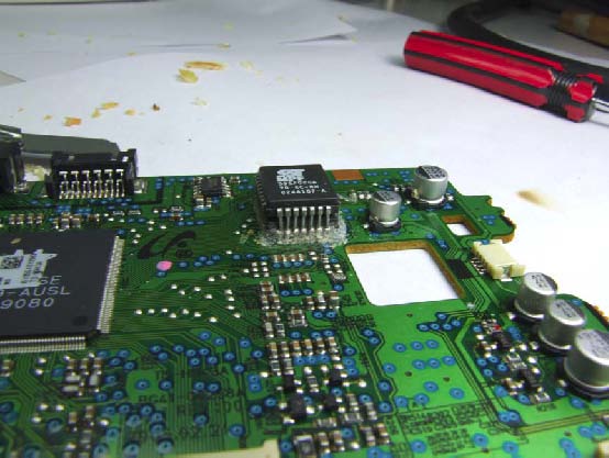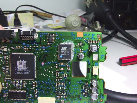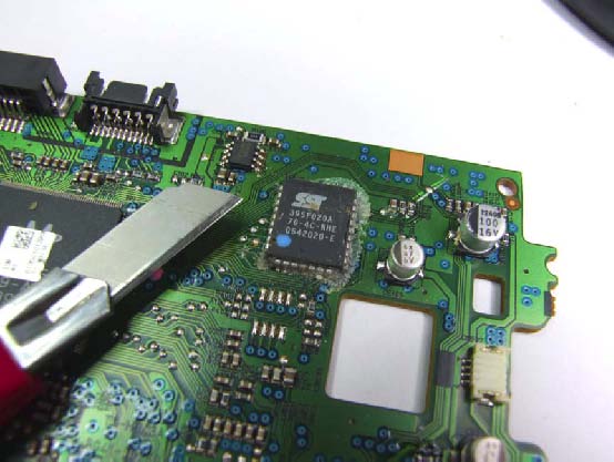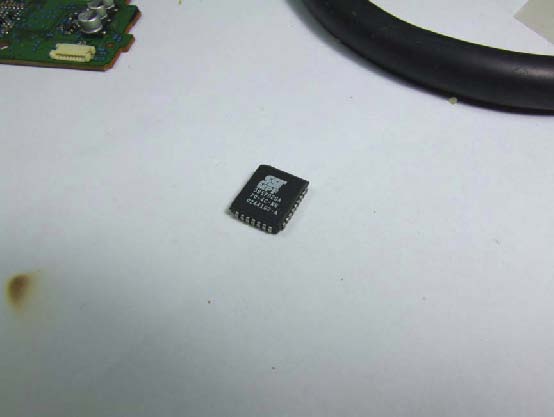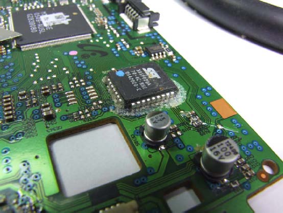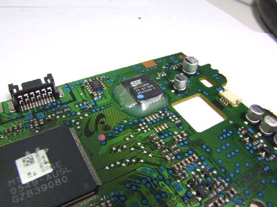 首先將XBOX360 的光碟機拿出來,然後將光碟機的電路板取出,我們可以看到在SST39SF020A 的IC 上被塗了一層塑狀物質,可以用熱風槍先加熱之後再用刀片之類的東西刮除。 |