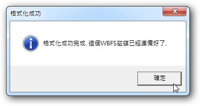 格式化成WBFS後下次再插上電腦主機會要求格式化,請不要按確定,否則又變回NTFS格式,若有安裝遊戲進去按下確定那遊戲全都會消失。